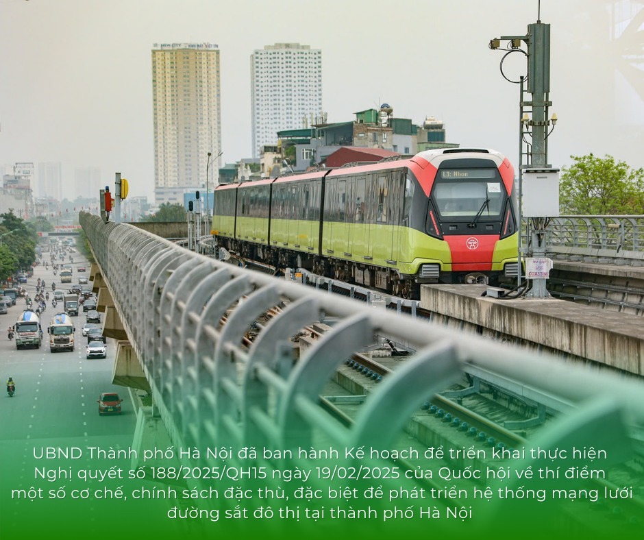 Ngày 24/5/2025, UBND Thành phố Hà Nội đã ban hành Kế hoạch để triển khai thực hiện Nghị quyết số 188/2025/QH15 ngày 19/02/2025 của Quốc hội về thí điểm một số cơ chế, chính sách đặc thù, đặc biệt để phát triển hệ thống mạng lưới đường sắt đô thị tại thành phố Hà Nội.