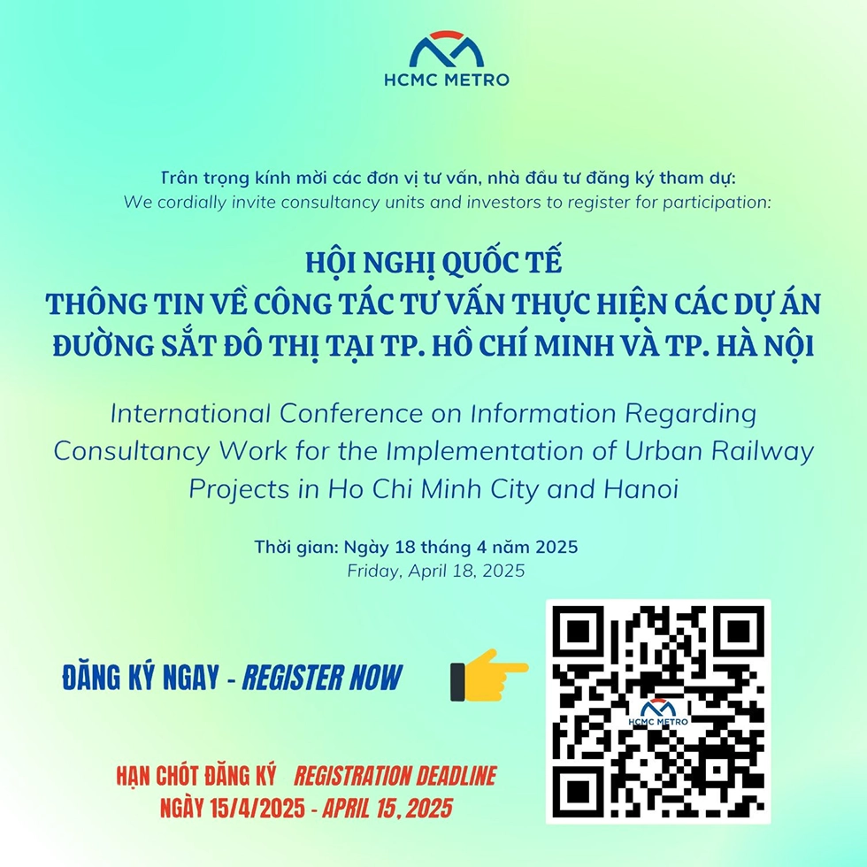 Thành phố Hồ Chí Minh và Hà Nội đang bước vào giai đoạn phát triển mạnh mẽ hệ thống đường sắt đô thị, mở ra những tiềm năng cho các nhà đầu tư, nhà thầu tư vấn trong nước và quốc tế. Nhằm đảm bảo tính công khai, minh bạch và thu hút sự tham gia của các công ty hàng đầu, "Hội nghị quốc tế: Thông tin về công tác tư vấn thực hiện các dự án đường sắt đô thị tại TP. Hồ Chí Minh và TP. Hà Nội" sẽ diễn ra vào: